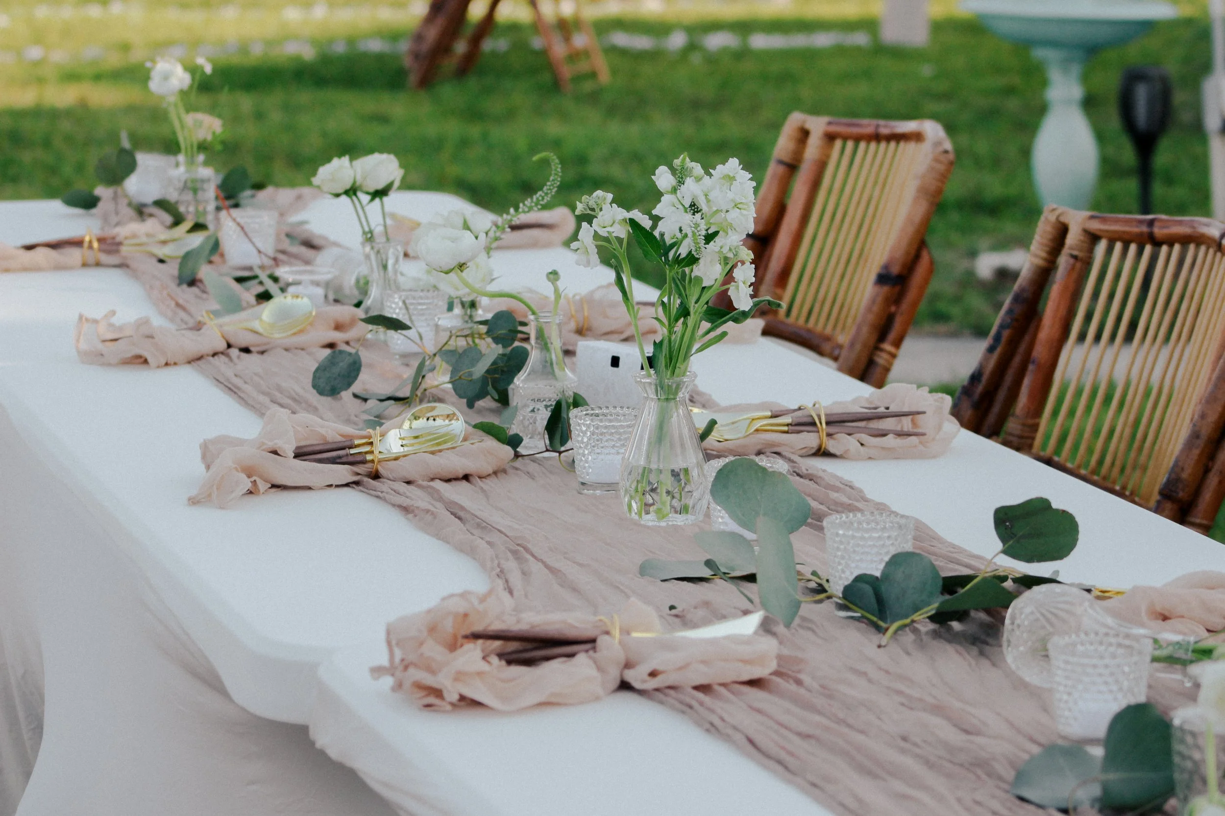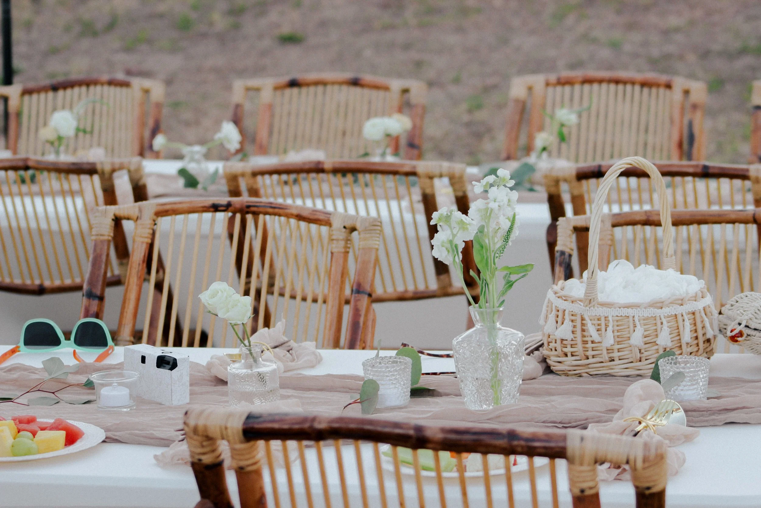 We deliver tables, chairs, and linens (in a storage bin) the day before your event and collect payment (cash or Venmo) at delivery. Chairs are set ceremony-style in front of the palm trees; reception tables are placed in the backyard (arrange as you wish). We return the day after to break down and collect—please clear tables and dispose of trash.